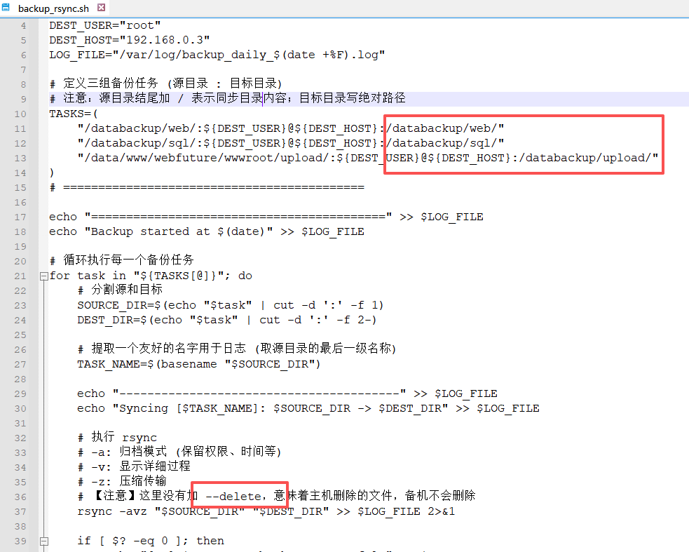 本脚本采用的是同步源主机三个目录下的文件夹到备机,并且rsync没有使用--delete,表示主机删除的文件,备机不删除,避免主机误删文件,备机的文件也被删除。